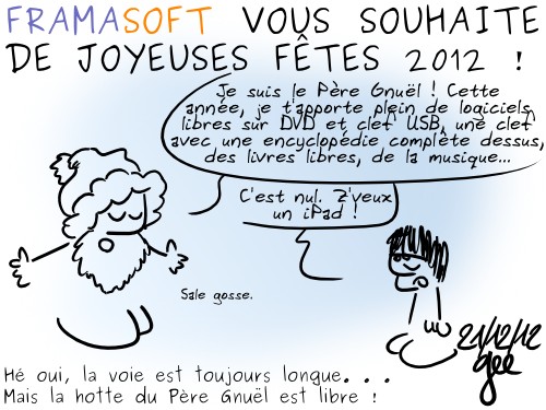 C’est autour de cette symbolique que l’April, Framasoft et La Quadrature du Net vous proposent de les soutenir durant tout le mois de décembre. Il y a un message fort à travailler ainsi en synergie. Il y a surtout une urgence à poursuivre notre travail de promotion et de défense du logiciel libre ainsi que le respect des droits et libertés du citoyen sur internet.