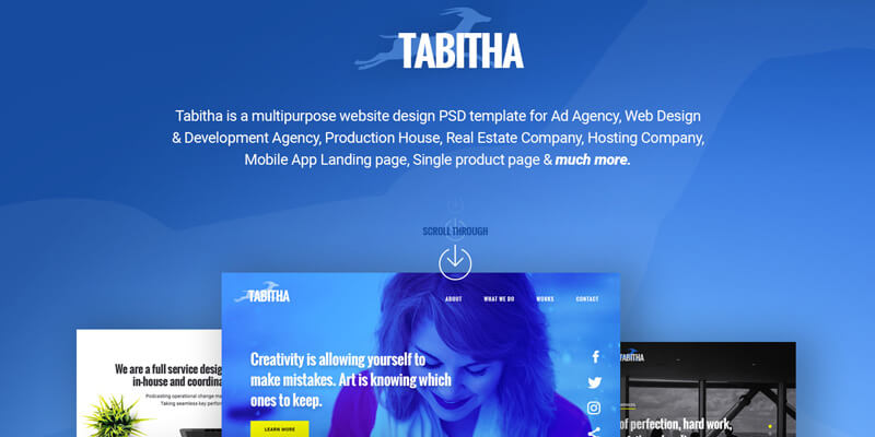 Tabitha is a multipurpose website template made in Illustrator and Photoshop for an ad, web design & development agency, or just to showcase mobile apps in a beautiful landing page. It is an organized document, with properly named layers, and icons.