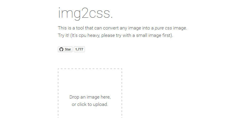 img2css is a JavaScript tool to convert any image (in multiple formats) to CSS. It puts the image on a canvas and calculates the array with the RGB values. It can be used to create pixel art login screens or pixel level animations. Download and implement it on your own server, or use online.